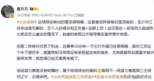 媒体人“勇方方”发文点评:这场球反映出的情况很明确,这套首发阵容绝对是顶级的,至少对江苏来说是无解的,五个人的得分和正负值+全都上双!这还是在一些球员久疏战阵大家没怎么磨合的情况下,赵睿的表现让许指导赛后直呼意外惊喜。