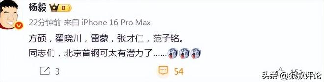 媒体人杨毅发文点评:“方硕,翟晓川,雷蒙,张才仁,范子铭。